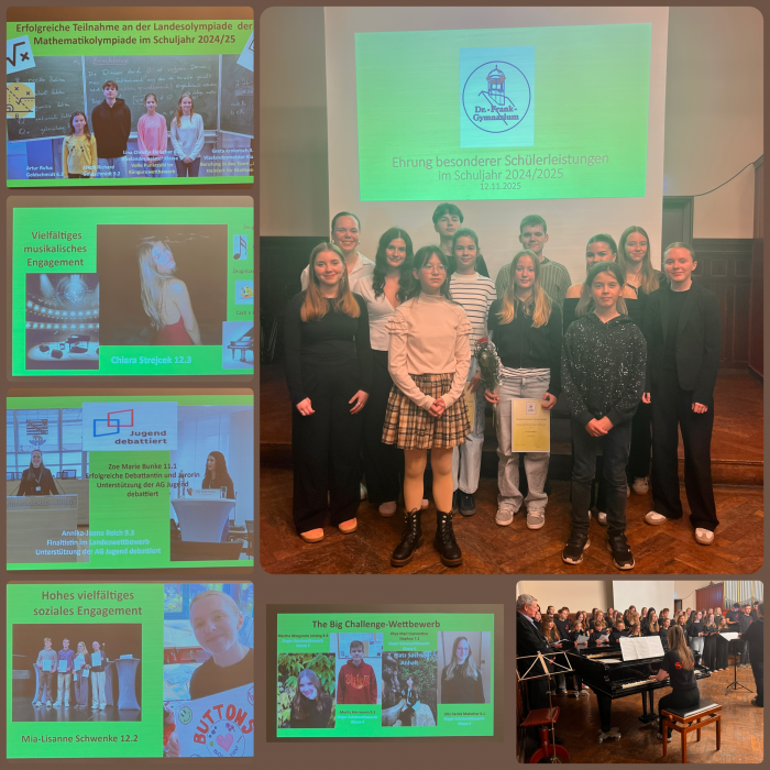 Am 30. Januar fand an unserer Schule die feierliche und alljährliche "Dr. Adolph Frank - Ehrung" statt. Diese besondere Veranstaltung wurde in Andacht an unseren Namensgeber durchgeführt und würdigte die herausragenden Leistungen bestimmter Schülerinnen und Schüler des Jahrgangs 5.